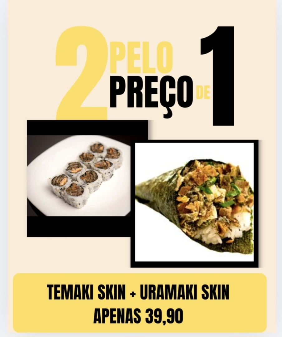 Skin é a pele do salmão grelhada com o peixe, acompanha cream cheese, cebolinha, arroz japonês e molho tarê